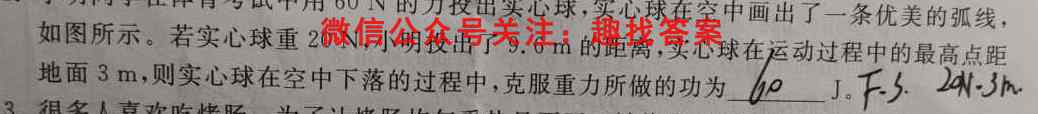 2.小明同学在体育考试中用60N的力投出实心球,实心球在空中画出了一条优美的弧线,如图所示。若实心球重20N,小明投出了9.6m的距离,实心球在运动过程中的最高点距地面3m,则实心球在空中下落的过程中,克服重力所做的功为60F.3.2041.3m