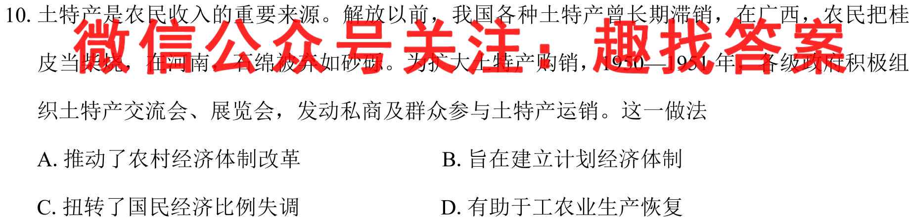 10.土特产是农民收入的重要来源。解放以前,我国各种土特产曾长期滞销,在广西,农民把桂皮当柴烧,在河南,石绵被弃如砂砾。为扩大土特产购销,1950-1951年,各级政府积极组织土特产交流会、展览会,发动私商及群众参与土特产运销。这一做法A.推动了农村经济体制改革B.旨在建立计划经济体制C.扭转了国民经济比例失调D.有助于工农业生产恢复