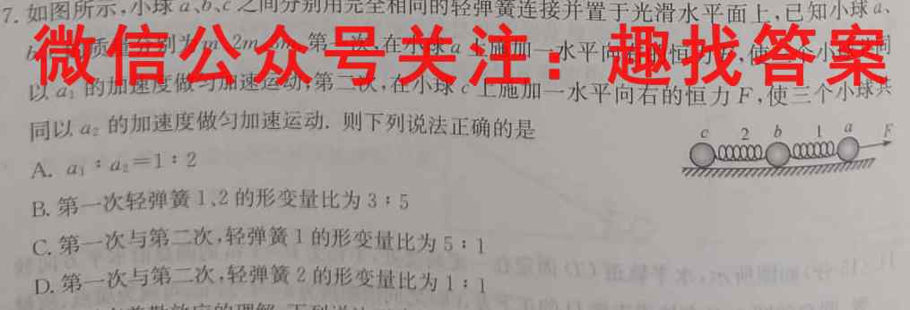 7.如图所示,小球a,b、c之间分别用完全相同的轻弹簧连接并置于光滑水平面上,已知小球a、m、2m、3m.ab、c的质量分别为m、2m、3m.第一次,在小球a上施加一水平向右的恒力F,使三个小球共同a1以a;的加速度做匀加速运动;第二次,在小球c上施加一水平向右的恒力F,使三个小球共a2同以a的加速度做匀加速运动.则下列说法正确的是A.a1:a2=1:2B.第一次轻弹簧1、2的形变量比为3:5C.第一次与第二次,轻弹簧1的形变量比为5:15:1D.第一次与第二次,轻弹簧2的形变量比为1:11:1
