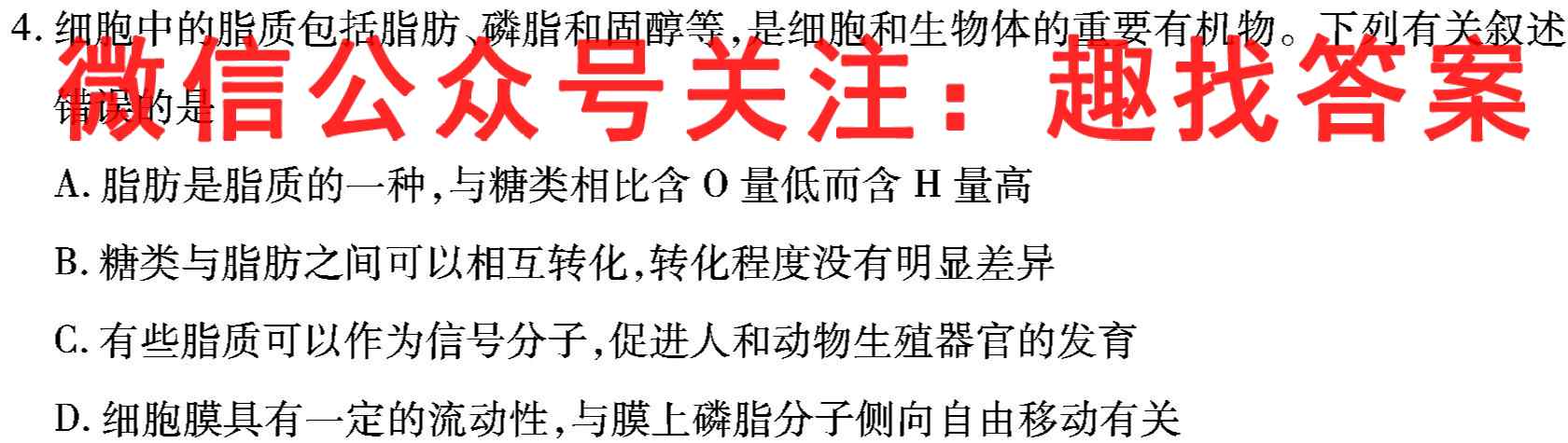 4.细胞中的脂质包括脂肪、磷脂和固醇等,是细胞和生物体的重要有机物。下列有关叙述错误的是A.脂肪是脂质的一种,与糖类相比含O量低而含H量高B.糖类与脂肪之间可以相互转化,转化程度没有明显差异C.有些脂质可以作为信号分子,促进人和动物生殖器官的发育D.细胞膜具有一定的流动性,与膜上磷脂分子侧向自由移动有关