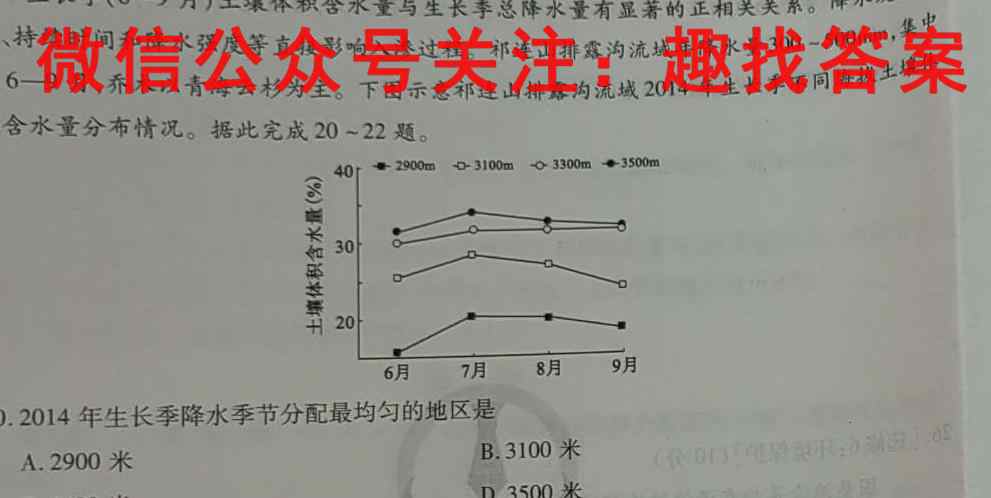 生长季(6-9月)土壤体积含水量与生长季总降水量有显著的正相关关系。降水发生时间、持续时间和降水强度等直接影响入渗过程。祁连山排露沟流域年降水量300~500mm,集中在6300∼500mm,6-9在69月,乔木以青海云杉为主。下图示意祁连山排露沟流域2014年生长季不同海拔土壤体积含水量分布情况。据此完成2022题。20.2014年生长季降水季节分配最均匀的地区是