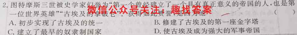 2.图特摩斯三世被史学家们誉为“第一个曾经建立了一个具有真正意义的帝国的人,也是第一位世界英雄”“古埃及的拿破仑”。获得如此赞誉,是因为他()A.初步实现了古埃及的统一B.修建了古埃及的第一座金字塔C.建立了最早的奴隶制国家D.使古埃及成为强大的军事帝国