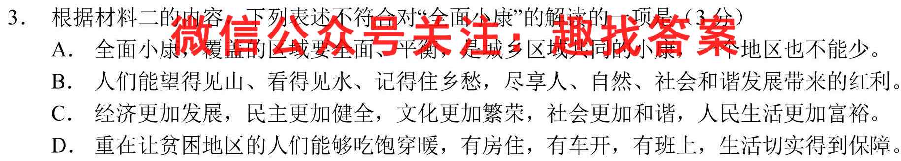 3.根据材料二的内容,下列表述不符合对“全面小康”的解读的一项是(3分)A.全面小康,覆盖的区域要全面、平衡,是城乡区域共同的小康,一个地区也不能少。B.人们能望得见山、看得见水、记得住乡愁,尽享人、自然、社会和谐发展带来的红利。C.经济更加发展,民主更加健全,文化更加繁荣,社会更加和谐,人民生活更加富裕。D.重在让贫困地区的人们能够吃饱穿暖,有房住,有车开,有班上,生活切实得到保障。