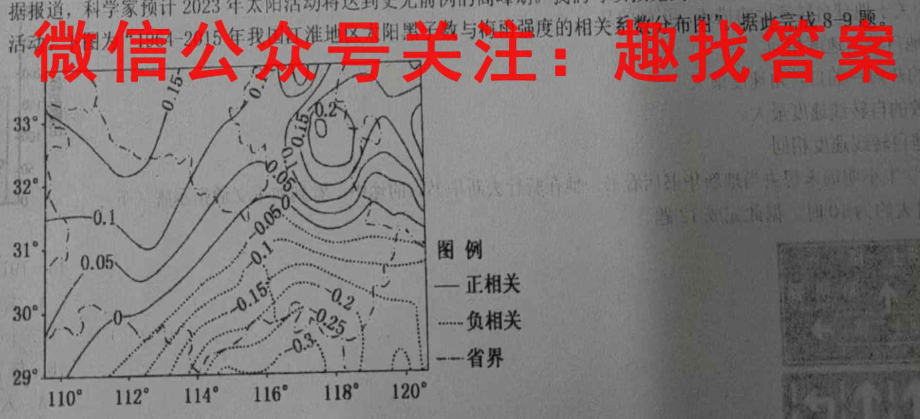 据报道,科学家预计2023年太阳活动将达到史无前例的高峰期。我们可以预见到那时将发生大量的太阳活动。下图为“1964-2015年我国江淮地区太阳黑子数与梅雨强度的相关系数分布图”。据此完成8-9题,