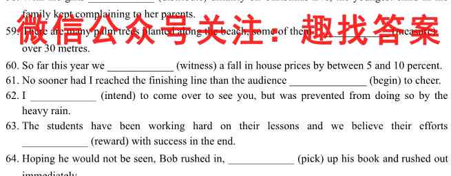 ____58.With the gifts (distribute) unfairly on Christmas Eve, the youngest child in thefamily kept complaining to her parents.59.There are many palm trees planted along the beach, some of them (measure)____over 30 metres.____60.So far this year we (witness) a fall in house prices by between 5 and 10 percent61.No sooner had I reached the finishing line than the audience (begin) to cheer.________62.I (intend) to come over to see you, but was prevented from doing so by theheavy rain.63.The students have been working hard on their lessons and we believe their efforts____(reward) with success in the end.