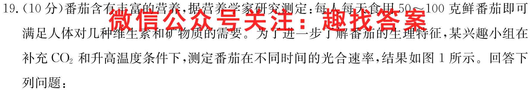19.(10分)番茄含有丰富的营养,据营养学家研究测定:每人每天食用50∼100克鲜番茄即可满足人体对几种维生素和矿物质的需要。为了进一步了解番茄的生理特征,某兴趣小组在补充CO2和升高温度条件下,测定番茄在不同时间的光合速率,结果如图1所示。回答下列问题:
