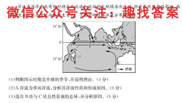 洋流是海洋中具有相对稳定的流速和流向的大规模海水运动,但受某些因素的影响,局部洋流在不同季节流向会发生变化。下图为印度洋洋流分布示意图。(1)判断图示时期北半球的季节,并说明理由。(4分)(2)A洋流为季风洋流,分析其洋流性质和形成原因。(6分)(3)指出B处与C处自然景观的差异,并分析原因。(8分)