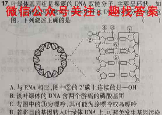 17.叶绿体基因组是裸露的DNA双链分子,主要呈环状。如图为某转基因植物的叶绿体中环状DNA的部分结构示意图。下列叙述正确的是()A.与RNA相比,图中②的2^1碳上连接的是-OHB.该叶绿体的DNA含两个游离的磷酸基团C.若图中的③为嘌呤,其可能为腺嘌呤或鸟嘌呤D.若将目的基因转人叶绿体DNA上,可避免发生基因污染