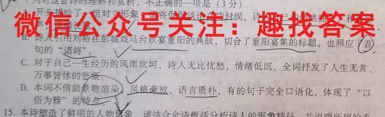 D4.下列对这首诗的理解和赏析,不正确的一项是(3分)A.开头描绘了一组对立形象:诸将侃侃谈论立功封侯,诗人自己却悄然独立,和着笛声,倚楼长歌。B.诗人引用刘裕在彭城戏马台欢宴重阳的典故,切合了重阳宴集的标题,也照应句的“诸将”。C.对于自己一生经历的风雨坎坷,诗人无比忧愁,情绪低沉,全词抒发了人生无常、万事皆休的悲概D.本词不借助素物渲染风格豪放,语言质朴,有的句子完全口语化,体现了“以俗为雅”的特点