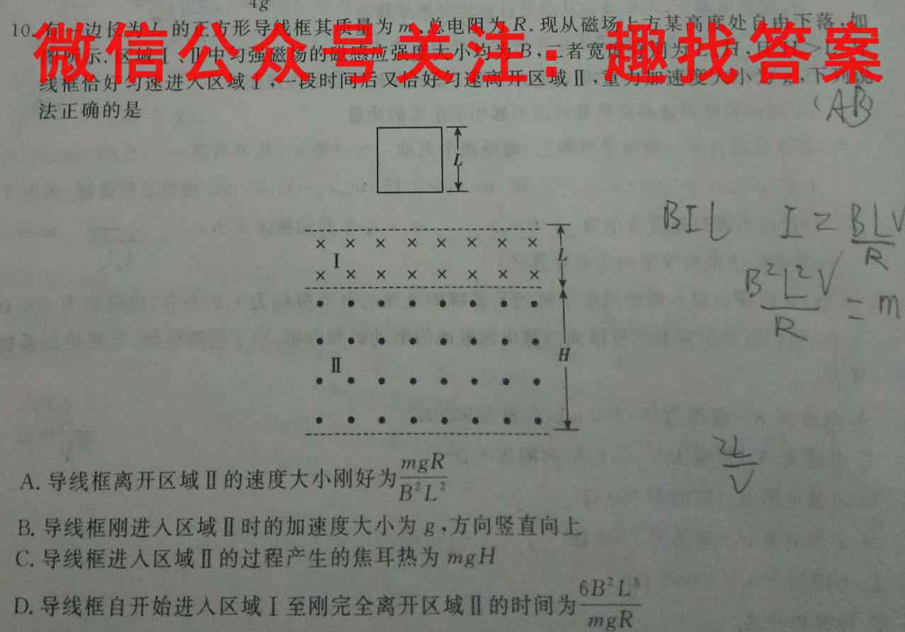 10.有一边长为L的正方形导线框其质量为m、总电阻为R.现从磁场上方某高度处自由下落,如图所示,区域I、Ⅱ中匀强磁场的磁感应强度大小均为B,二者宽度分别为L、H.且H>L.导线框恰好匀速进人区域I,一段时间后又恰好匀速离开区域Ⅱ,重力加速度大小为g,下列说法正确的是ABLBILI=BLIB2VHA.导线框离开区域Ⅱ的速度大小刚好为mgRB^2L^2B.导线框刚进人区域Ⅱ时的加速度大小为g,方向竖直向上C.导线框进入区域Ⅱ的过程产生的焦耳热为mgHD.导线框自开始进入区域至刚完全离开区域Ⅱ的时间为6B^2L^3mgR