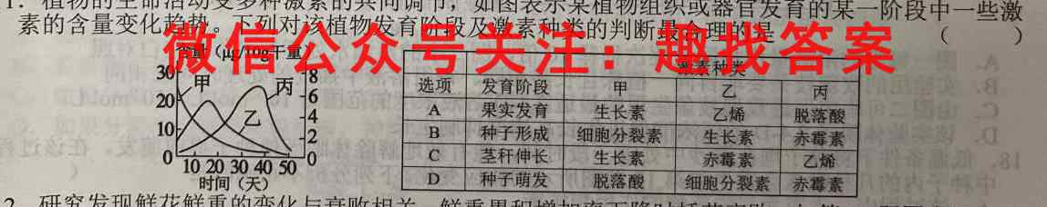 11.植物的生命活动受多种激素的共同调节,如图表示某植物组织或器官发育的某一阶段中一些激素的含量变化趋势。下列对该植物发育阶段及激素种类的判断最合理的是()含量(/10gg干重)30甲丙82204108101002030440550时间(天))