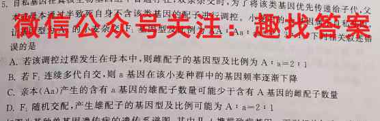 5.自私基因在真核生物基因组中普遍存在,双亲杂交时,为了将该类基因优先传递给子代,父本成母本通过半致死自身不含该类基因的配子进行调控,小麦中的A基因属于自私基因,F1让基因型为Aa的小麦杂交,F:基因型及比例为AA:Aaaa=2:31.下列相关叙述错AA:Aa:aa=2:3:1误的是A.若该调控过程发生在母本中,则雌配子的基因型及比例为A+a=21A:a=2:1B.若F:连续多代自交,则a基因在该小麦种群中的基因频率逐渐下降F1C.亲本(Aa)产生的含有a基因的雄配子数量可能少于含有A基因的雌配子数量D.F1随机交配,产生雄配子的基因型及比例可能为A:a=2:1