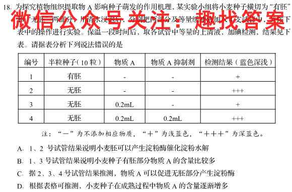 18.为探究植物组织提取物A影响种子萌发的作用机理,某实验小组将小麦种子横切为“有胚”和“无胚”两部分,用清水浸泡后,分别把两部分及等量缓冲液加入4支试管中,并按下表中的操作进行实验。保温一段时间后,取各试管中等量的上清液,加碘检测,结果见下表。请据表分析下列说法错误的是注:“一”为不添加相应物质,“+”为浅蓝色,“+++”为深蓝色。A.1、2号试管结果说明小麦胚可以产生淀粉酶催化淀粉水解B.1、3号试管结果说明小麦种子有胚部分物质A的含量比较多C.据2、3、4号试管结果推测,物质A可以促进无胚部分产生淀粉酶D.根据表格可推测,小麦种子在成熟过程中物质A的含量逐渐增多