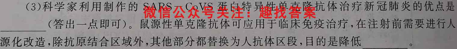 (3)科学家利用制作的SARS-CoVS蛋白特异性单克隆抗体治疗新冠肺炎的优点是(答出一点即可)。鼠源性单克隆抗体可应用于临床免疫治疗,在注射前需要进行人源化改造,除抗原结合区域外,其他部分都替换为人抗体区段,目的是降低。