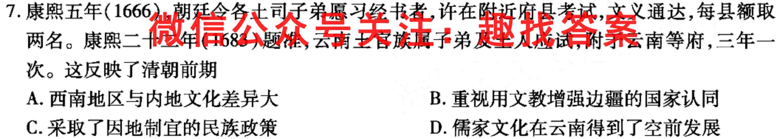 7.康熙五年(1666),朝廷令各土司子弟愿*经书者,许在附近府县考试,文义通达,每县额取两名。康熙二十二年(1683)题准,云南土官族属子弟及土人应试,附于云南等府,三年一次。这反映了清朝前期A.西南地区与内地文化差异大B.重视用文教增强边疆的国家认同C.采取了因地制宜的民族政策D.儒家文化在云南得到了空前发展