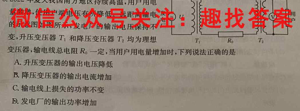 8.2022年夏天我国南方地区持续高温,用户用电量激增,使用户端电压有所降低。远距离输电发的示意图如图所示,发电厂的输出电压保持不厂变,升压变压器T1和降压变压器T2均为理想变压器,输电线总电阻R0一定,当用户用电量增加时,下列说法正确的是A.升压变压器的输出电压降低B.降压变压器的输出电流增加C.输电线上损失的功率不变D.发电厂的输出功率增加