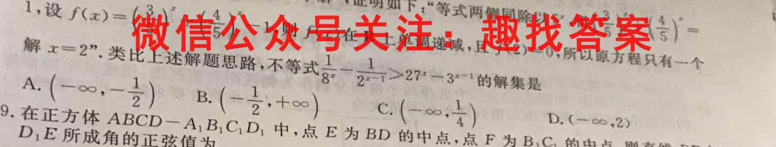 3^x+4^x=5^x8.若要求证“方程3*+4=5只有一个解”,证明如下“等式两侧同除以5,得1,设f(x)=(35)^x+(45)^x-15^x,得f(x.(35)^x+(45)^2=)在R上单调递减,且x=2”.f(2)=0,所以原方程只有一个类比上述解题思路,不等式式。18^x-12^x-1>27^x-3^x-1的解集是A.(-,-12)B.(-12,+)C.(-,14)D.(-∞,2)