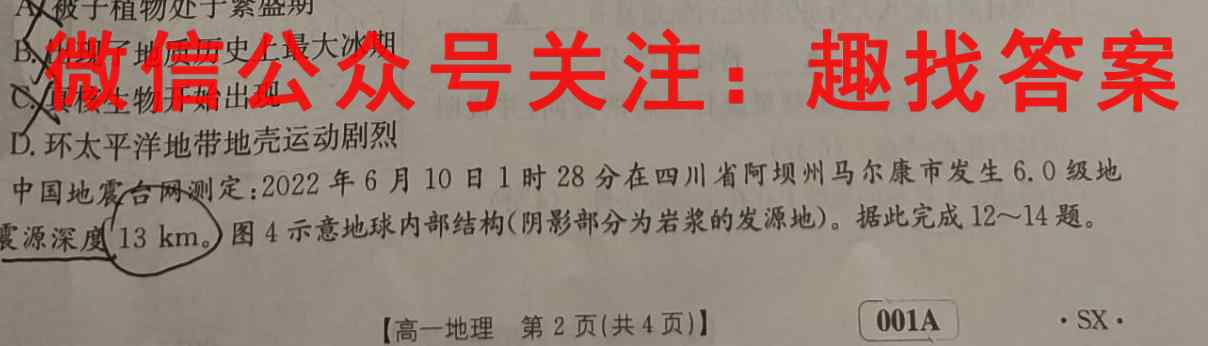 11.禽龙繁盛时期DA√被子植物处于繁盛期B.出现了地质历史上最大冰期B.真核生物开始出现D.环太平洋地带地壳运动剧烈台网测定:2022年6月10日1时28分在四川省阿坝州马尔康市发生6.0级地中国地震震,震源深度13km。)图4示意地球内部结构(阴影部分为岩浆的发源地)。据此完成12~14题。SX