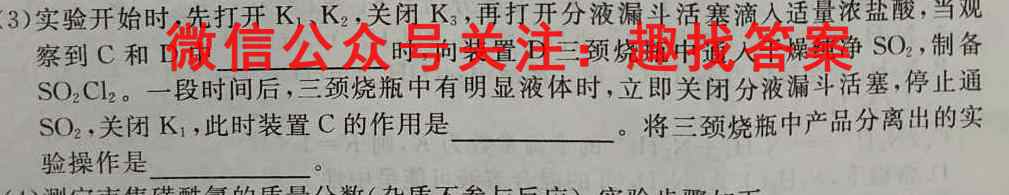(3)实验开始时,先打开K1、K2,关闭K3,,再打开分液漏斗活塞滴入适量浓盐酸,当观察到C和D中时,向装置D时,向装置D三颈烧瓶中通人干燥纯净SO2,,制备SO2Cl2。,一段时间后,三颈烧瓶中有明显液体时,立即关闭分液漏斗活塞,停止通SO2,,关闭K1,,此时装置C的作用是。将三颈烧瓶中产品分离出的实验操作是。
