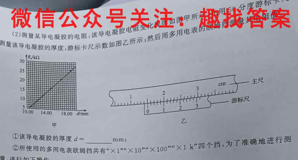 12.(8分)在研究欧姆表的使用和工作原理时,某物理兴趣小组依次进行下列操作。(1)对欧姆表刻度的认识:用调整好的欧姆表测滑动变阻器的电阻,绘制R-θ图像,R为滑动变阻器被测量部分的电阻,0为表针相对于表盘左侧转过的角度,下列图像中可能正确的是。(填正确答案标号)测量示数阻(亥导电凝测量该导电凝胶的厚度,游标卡尺示数如图乙所示;然后用多用电表的欧姆挡测量其电阻值。(2)测量某导电凝胶的电阻:该导电凝胶电阻变化规律如图甲所示,先用50分度游标卡尺①该导电凝胶的厚度d=mm;②所使用的多用电表欧姆挡共有“×1”“×10”“×100”“×1k”四个挡,为了准确地进行测“×1”“×10”×100“×1k”