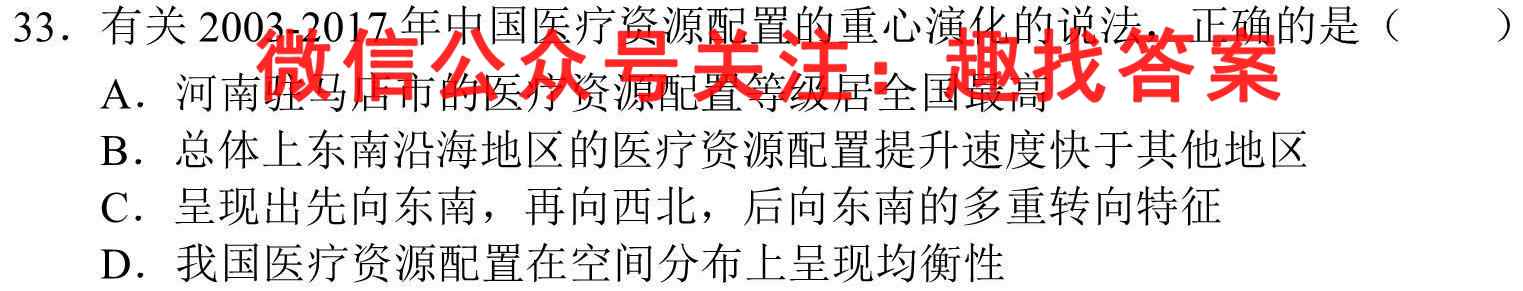 33.有关2003-2017年中国医疗资源配置的重心演化的说法,正确的是()A.河南驻马店市的医疗资源配置等级居全国最高B.总体上东南沿海地区的医疗资源配置提升速度快于其他地区C.呈现出先向东南,再向西北,后向东南的多重转向特征D.我国医疗资源配置在空间分布上呈现均衡性