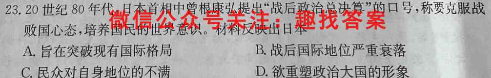 23.20世纪80年代,日本首相中曾根康弘提出“战后政治总决算”的口号,称要克服战败国心态,培养国民的世界意识。材料反映出日本A.旨在突破现有国际格局B.战后国际地位严重衰落C.民众对自身地位的不满D.欲重塑政治大国的形象