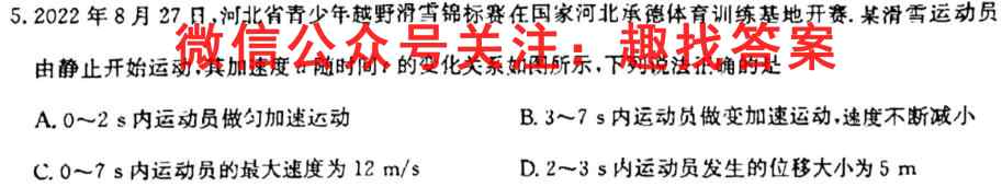 5.2022年8月27日,河北省青少年越野滑雪锦标赛在国家河北承德体育训练基地开赛.某滑雪运动员由静止开始运动,其加速度a随时间t的变化关系如图所示,下列说法正确的是A.0∼s内运动员做匀加速运动B.3~7s内运动员做变加速运动,速度不断减小C.0~7s内运动员的最大速度为12m/sD.2~3s内运动员发生的位移大小为5m