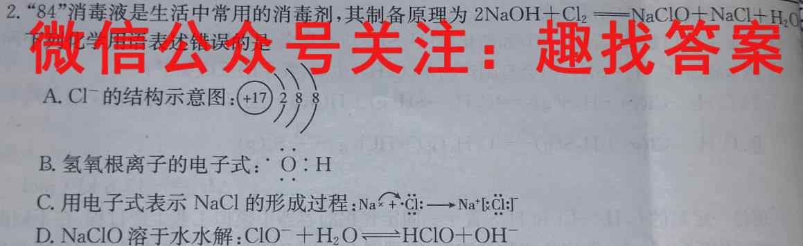 2.“84”消毒液是生活中常用的消毒剂,其制备原理为2NaOH+Cl2NaClO+NaCl+H2O下列化学用语表述错误的是A.Cl^-的结构示意图:B.氢氧根离子的电子式:O:HC.用电子式表示NaCl的形成过程:D.NaClO溶于水水解:ClO^-+H2OHClO+OH^-
