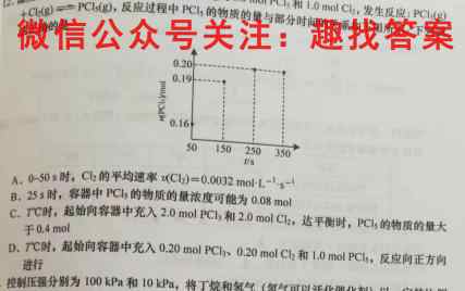 2.0LTC1.度为时,向20L恒容密闲容器中充入L0molPCl和L0molClg,发生反应:PClg)1.0molPCl3PCl51.0molCl2,+CHg)PCl(g),反应过程中PCl,的物质的量与部分时间的关系如下图所示。下列说+Cl2(g)PCl3(g),正确的是.200.0.190.1.16501502503505050sA.0-50s时,C的平均速率(Cl)=0.0032mol-L-‘-tA.Cl2v(Cl2)=0.0032molL^-1s^-4PCl5B.25时,容器中PCl的物质的量浓度可能为0.08mal0.08molT^C2.0molPCl3C.I时,起始向容器中充入2.0molPCl和20molC,达平衡时,PCl,的物质的量大2.0molCl2,PCl5于0.4mol0.20molPCl3、0.20molCl2D.C时,起始向容器中充入0.20molPCly0.20molCl:和10molPCl,反应向正方向l21.0molPCl5,进行