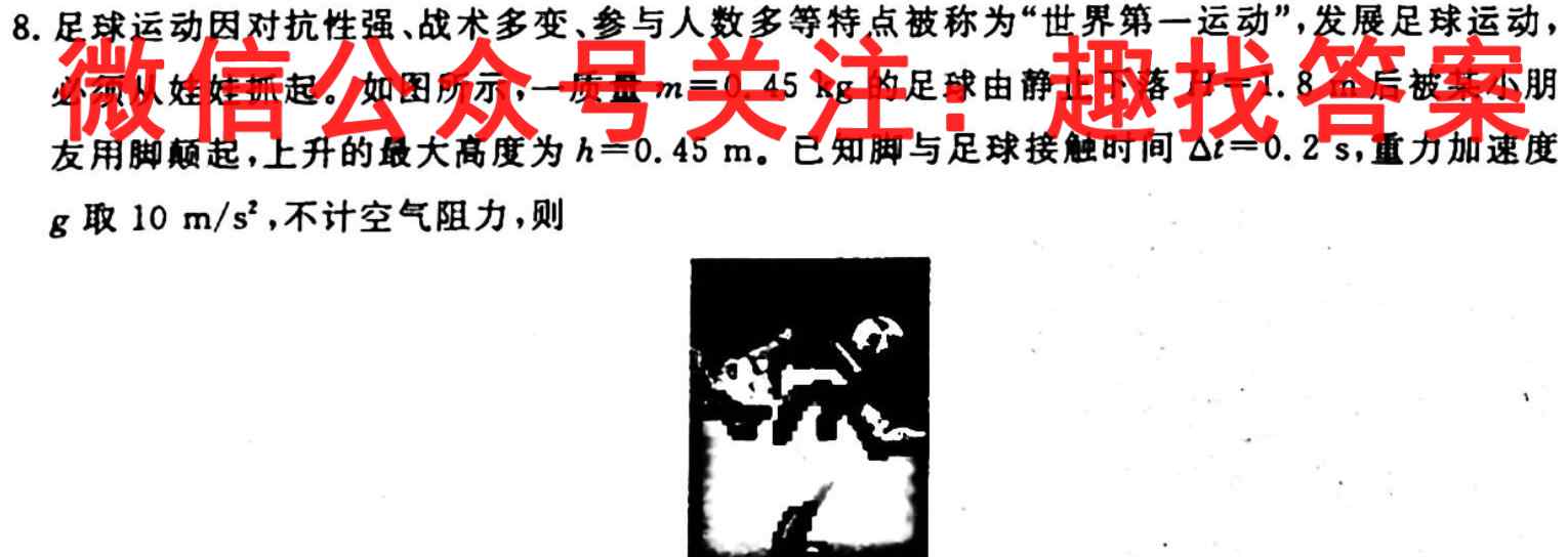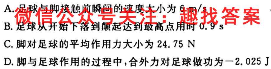 8.足球运动因对抗性强、战术多变、参与人数多等特点被称为“世界第一运动”,发展足球运动,必须从娃娃抓起。如图所示,一质量m=0.45kg的足球由静止下落H=1.8m后被某小朋友用脚颠起,上升的最大高度为h=0.45m。,已知脚与足球接触时间△t=0.2s,重力加速度g取10m/s^2,,不计空气阻力,则A.足球与脚接触前瞬间的速度大小为6m/sB.足球从开始下落到颠起达到最高点用时0.9sC.脚对足球的平均作用力大小为24.75ND.脚与足球作用的过程中,合外力对足球做功为一2.025J