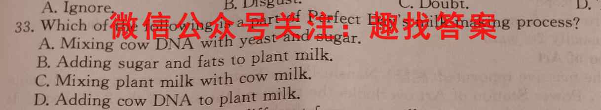 33. Which of the following is a part of Perfect Day’s milk-making process?A. Mixing cow DNA with yeast and sugar.B.Adding sugar and fats to plant milk.C.Mixing plant milk with cow milk.D.Adding cow DNA to plant milk.