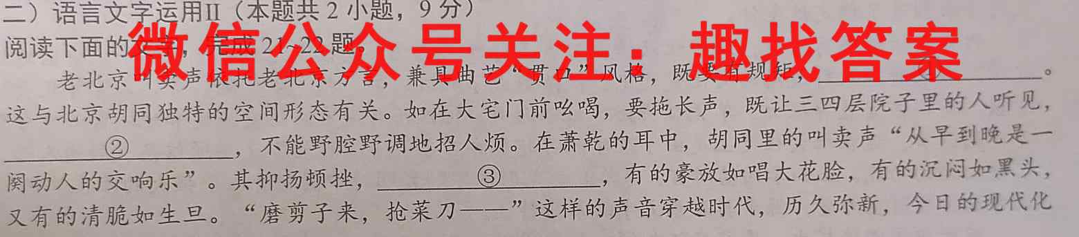 (二)语言文字运用Ⅱ(本题共2小题,9分)阅读下面的文字,完成21~22题。老北京叫卖声依托老北京方言,兼具曲艺“贯口”风格,既要有规矩,①。这与北京胡同独特的空间形态有关。如在大宅门前吆喝,要拖长声,既让三四层院子里的人听见,②,不能野腔野调地招人烦。在萧乾的耳中,胡同里的叫卖声“从早到晚是一阕动人的交响乐”。其抑扬顿挫,③,有的豪放如唱大花脸,有的沉闷如黑头,又有的清脆如生旦。“磨剪子来,抢菜刀——”这样的声音穿越时代,历久弥新,今日的现代化小区里仍能不时听见。