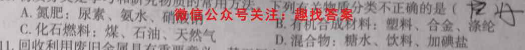 10.物质分类是学*和研究物质的常用方法。下列有关物质分类不正确的是(24A.氮肥:尿素、氨水、硝酸钠B.有机合成材料:塑料、合金、C.化石燃料:煤、石油、天然气D.混合物:糖水、饮料、加碘盐