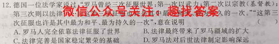 12.德国一位法学家说过:“罗马曾经三次征服世界:第一次以武力;第二次以宗教(基督教);第三次则以法律……而这第三次征服也许是其中最为和平、最为持久的一次。”“这第三次征服也许是其中最为和平、最为持久的一次”,意在说明()A.罗马人完全依靠法律征服了世界B.法律最终带来了罗马疆域的扩大C.法律完善是国家稳定繁荣的基础D.罗马法对后世法律制定影响深远