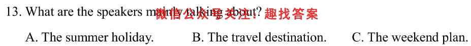 13.What are the speakers mainly talking about?A.The summer holiday.B.The travel destination.C.The weekend plan.