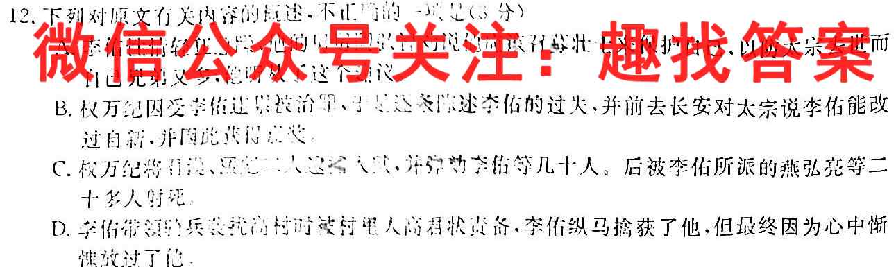 12.下列对原文有关内容的述,不的-是(j分)A.李性情轻韭、他的!说池应壮米保护自已,以防太宗去世而自己兄弟又多,他听从了这个议:B.权万纪因爱李佰让以被治、于足还条述李佑的过失,并前去长安对太宗说李佑能改C.权万纪将目、心二八人,李佑等几十人。后被李佑所派的燕弘亮等二十多人射死。D.李佑带领兵扰高村时被村里人高君状责备,李佑纵马擒获了他,但最终因为心中惭愧放过了他。