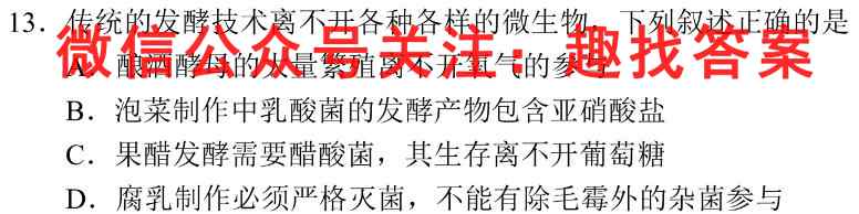 13.传统的发酵技术离不开各种各样的微生物,下列叙述正确的是A.酿酒酵母的大量繁殖离不开氧气的参与B.泡菜制作中乳酸菌的发酵产物包含亚硝酸盐C.果醋发酵需要醋酸菌,其生存离不开葡萄糖D.腐乳制作必须严格灭菌,不能有除毛霉外的杂菌参与