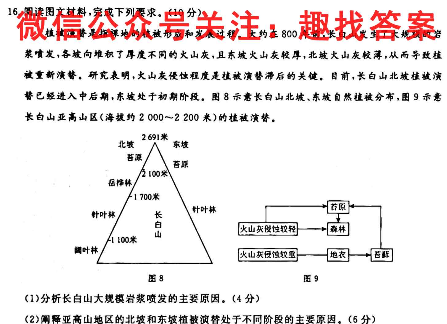 16.阅读图文材料,完成下列要求。(10分)植被演替是指裸地的植被形成和发展过程。大约在800年前,长白山发生了大规模的岩浆喷发,各坡向堆积了厚度不同的火山灰,且东坡火山灰较厚,北坡火山灰较薄,从而导致植被重新演替。研究表明,火山灰蚀程度是植被演替滞后的关键。目前,长白山北坡植被演替已经进入中后期,东坡处于初期阶段。图8示意长白山北坡、东坡自然植被分布,图9示意长白山亚高山区(海拔约200200米)的植被演替,(1)分析长白山大规模岩浆喷发的主要原因。(4分)(2)阐释亚高山地区的北坡和东坡植被演替处于不同阶段的主要原因。(6分)