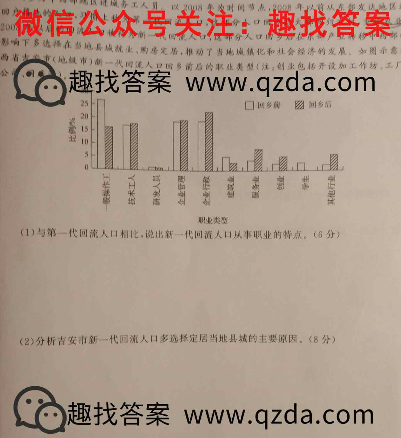 回流人口在研究中可被定义为在我国东部发达地区务工后因某些原因返回户籍所在地人口,多为中西部地区进城务工人员。以2008年为时间节点,2008年以前从东部发达地区回户籍地的人口,*惯上称为第一代回流人口,这部分人口回乡后大都回归农村,重操农业2008年以后的回流人口被称为新一代回流人口,这部分人口回乡后在东部产业转移中西部影响下多选择在当地县城就业、购房定居,推动了当地城镇化和社会经济的发展。如图示意西省古市(地级市)新一代回流人口回乡前后的职业类型(注:创业包括开设加工作坊、工厂公)。走趣.com(1)与第一代回流人口相比,说出新一代回流人口从事职业的特点。(6分)(2)分析吉安市新一代回流人口多选择定居当地县城的主要原因。(8分)趣找答案ww.qzda.com