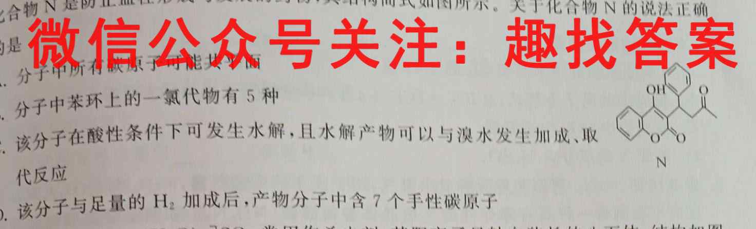 5.化合物N是防止血栓形成与发展的药物,其结构简式如图所示。关于化合物N的说法正确说法正确的是A.分子中所有碳原子可能共平面B.分子中苯环上的一氯代物有5种C.该分子在酸性条件下可发生水解,且水解产物可以与溴水发生加成、取代反应H2D.该分子与足量的H加成后,产物分子中含7个手性碳原子