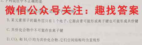 11.下列说法中不正确的是A.含有离子键的化合物一定是离子化合物B.某元素原子的最外层只有1个电子,它跟卤素可能形成离子键也可能形成共价键C.共价化合物中不可能存在离子键D.CO2和H2O均为共价化合物,它们空间结构均为直线形