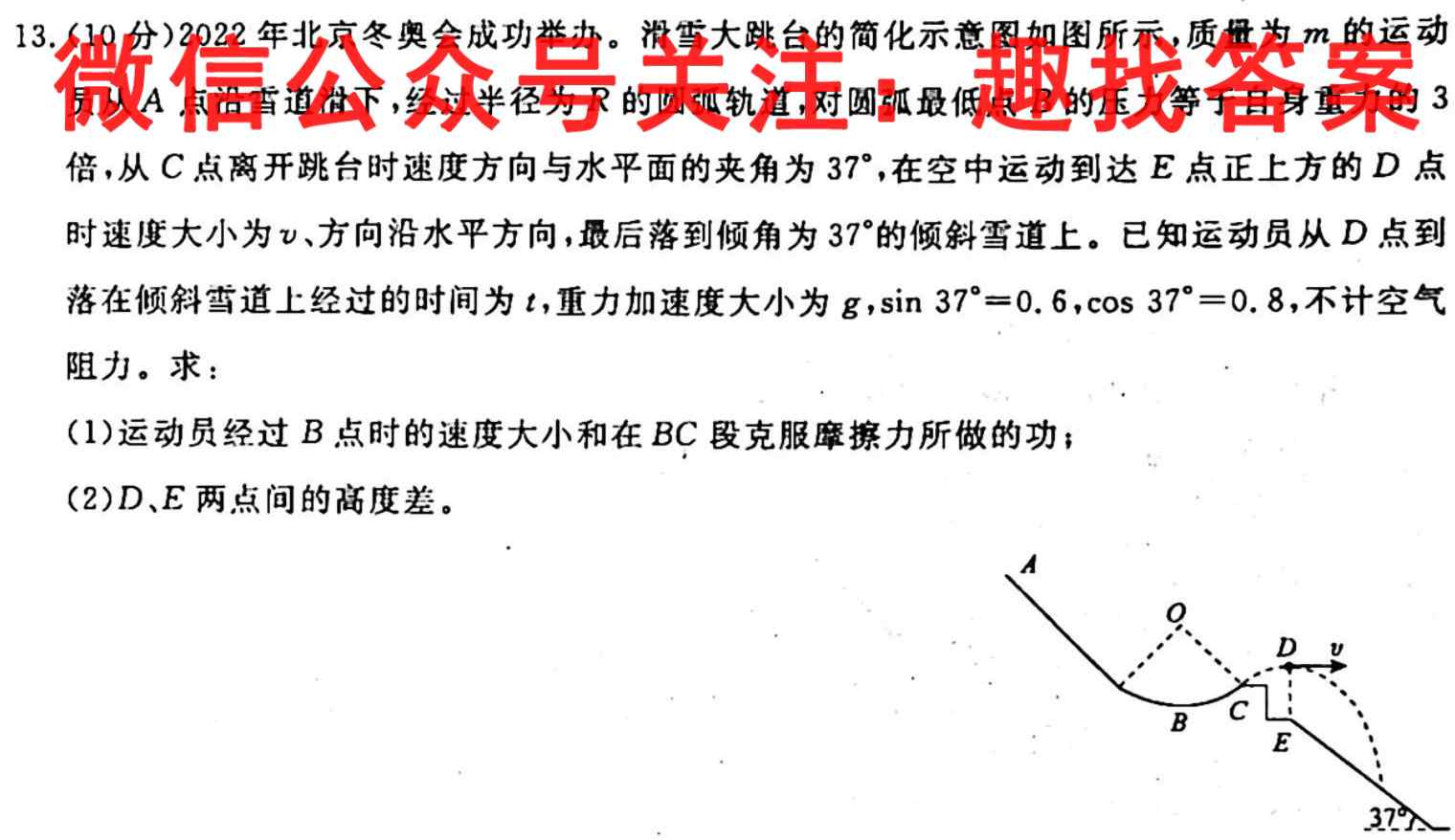 13.(10分)2022年北京冬奥会成功举办。滑雪大跳台的简化示意图如图所示,质量为m的运动员从A点沿雪道滑下,经过半径为R的圆弧轨道,对圆弧最低点B的压力等于自身重力的3倍,从C点离开跳台时速度方向与水平面的夹角为37^,在空中运动到达E点正上方的D点时速度大小为v、方向沿水平方向,最后落到倾角为37^的倾斜雪道上。已知运动员从D点到落在倾斜雪道上经过的时间为t,重力加速度大小为g,37^=0.6,37^=0.8,,不计空气阻力。求:(1)运动员经过B点时的速度大小和在BC段克服摩擦力所做的功;(2)D、E两点间的高度差。3