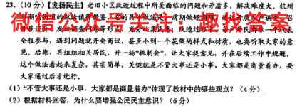 23.(10分)【发扬民主】老旧小区改造过程中所要面临的问题和矛盾多,解决难度大,杭州市潮鸣街道的做法值得借鉴,它的具体做法是,前期做好调研,通过开展入户调查、开座谈会、发放调查问卷等形式,充分收集民意;改造过程中,每户居民都派一个代表全程参与,遇到问题就开会商议,甚至小到一个花架的样式和材质,也要听取大家的意见。后期,再组织相关居民,开一场“挑刺会”,让大家提意见,并在后续工作中规避,这个做法看起来复杂,其实简单,关键就是不管大事还是小事,大家都是商量着办,要大家通过后才进行,(1)“不管大事还是小事,大家都是商量着办”体现了教材中的些观点?(4分)(2)根据材料回答,为什么要增强公民民主意识?(6分)