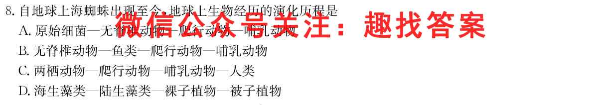 8.自地球上海蜘蛛出现至今,地球上生物经历的演化历程是A.原始细菌一无脊椎动物一爬行动物一哺乳动物B.无脊椎动物一鱼类一爬行动物一哺乳动物C.两栖动物一爬行动物一哺乳动物一人类D.海生藻类一陆生藻类一裸子植物一被子植物