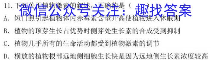 11.下列关于植物激素的叙述,正确的是()A.短日照引起植物体内赤霉素含量升高使植物进入休眠期B.植物的顶芽生长占优势时侧芽处生长素的合成受到抑制C.植物几乎所有的生命活动都受到植物激素的调节D.横放的植物根部远地侧细胞生长快是因为远地侧生长素浓度较高