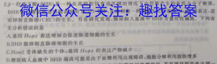2.3一羟基丁酸(BHB)是一种在高脂肪饮食或饥饿的情况下由肝脏产生的有机小分子物质,BHB通过激活肠道细胞表面的Hcar2受体,从而刺激一种减缓生长的基因Hopx的表达,进面抑制直肠癌(CRC)的生长,另有研究发现,糖尿病人血液中BHB含量往往偏高,下列有关分析错误的是A.基因Hopx表达增加会促进肠道细胞的生长B.BHB能抑制直肠癌细胞的生长.Hcar2受体缺失的个体,基因Hopx的表达产物减少D.糖病人血液中BHB偏高可能是由于血糖利用出现障碍,细胞分解利用脂肪增多