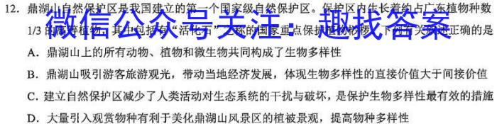 12.鼎湖山自然保护区是我国建立的第一个国家级自然保护区。保护区内生长着约占广东植物种数1/3的高等植物,其中包括有“活化石”之称的国家重点保护植物松椤。下列有关叙述正确的是A.鼎湖山上的所有动物、植物和微生物共同构成了生物多样性B.鼎湖山吸引游客旅游观光,带动当地经济发展,体现生物多样性的直接价值大于间接价值C.建立自然保护区减少了人类活动对生态系统的干扰与破坏,是保护生物多样性最有效的措施D.大量引入观赏物种有利于美化鼎湖山风景区的植被景观,提高物种多样性