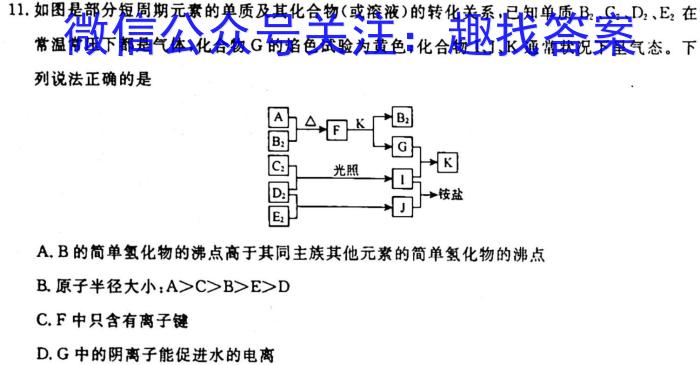 11.如图是部分短周期元素的单质及其化合物(或溶液)的转化关系,已知单质B2、C2、D2、E2在常温常压下都是气体,化合物G的焰色试验为黄色;化合物I、J、K通常状况下呈气态。下列说法正确的是A.B的简单氢化物的沸点高于其同主族其他元素的简单氢化物的沸点B.原子半径大小:A>C>B>E>DC.F中只含有离子键D.G中的阴离子能促进水的电离