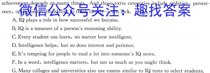 35.What is the best title for the text?A.Wildlife crossings save wild animals and moneyB.The size of wildlife crossings affects animals greatlyC.Every wildlife crossing has a great effect on road safetyD.Wildlife crossings manage to help animals migrate safelyachievement depends on many things. And those extra categories include ambition, persist-ence, opportunity, the ability to think clearly—even luck. 40A.IQplays a role in how successful we become.B.IQis a measure of a person’s reasoning ability.C.Every student can learn, no matter how intelligent.D.Intelligence helps, but so does interest and patience.E.It’s tempting for people to read a lot into someone’sIQ score.F.In a word, intelligence matters, but not as much as you might think.G.Many colleges and universities also use exams similar to IQ tests to select students