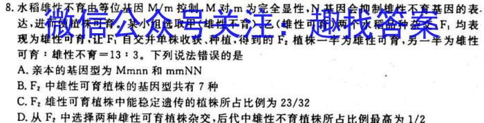 8.水稻雄性不育由等位基因M/m控制,M对m为完全显性,N基因会抑制雄性不育基因的表.达,进而使植株可育。某小组选取甲(雄性不育)、乙(雄性可育)两个水稻品种杂交,F1均表现为雄性可育,让F1自交并单株收获、种植,得到的F2植株一半为雄性可育,另一半为雄性可育:雄性不育=13:3。。下列说法错误的是A.亲本的基因型为Mmn和mmNNB.F2中雄性可育植株的基因型共有7种C.F2雄性可育植株中能稳定遗传的植株所占比例为23/32D.从F2中选择两种雄性可育植株杂交,后代中雄性不育植株所占比例最高为1/2